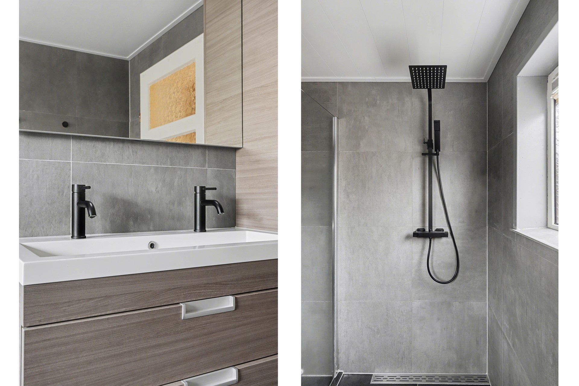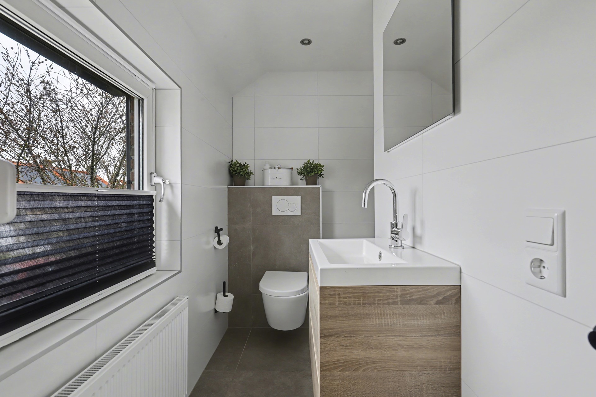 De woning beschikt over een nette, volledig betegelde badkamer op de begane grond. Deze is uitgerust met een inloopdouche, dubbele wastafel en een designradiator, modern en direct te gebruiken.
