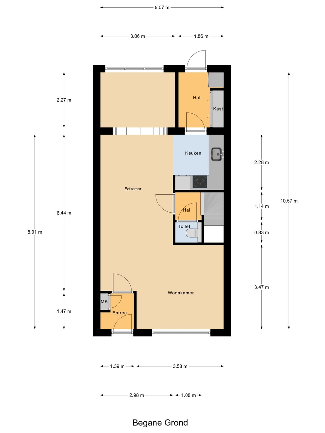 Via de voordeur komt u in de ruime hal/entree met toegang tot de royale woonkamer en meterkast.