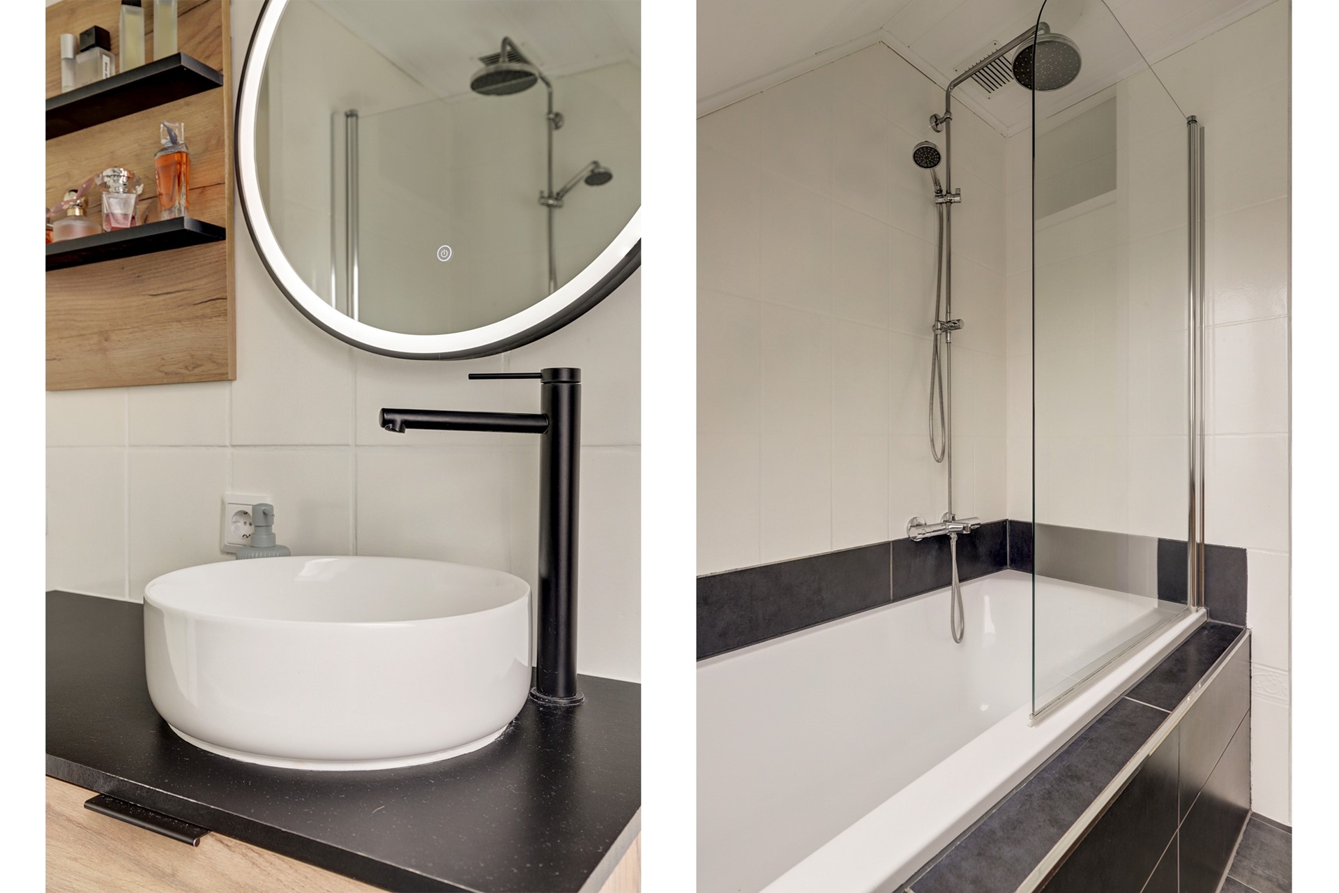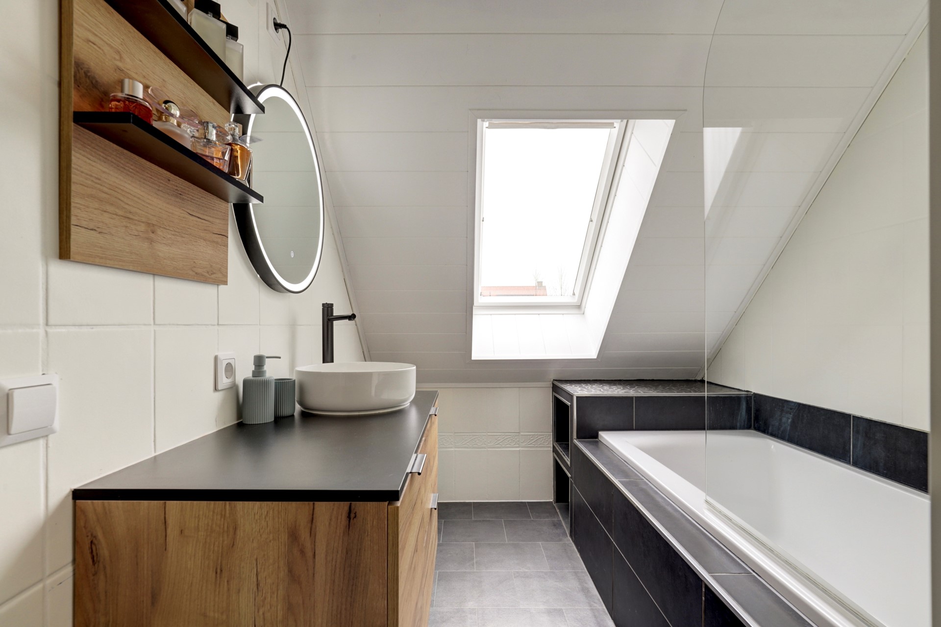 De moderne badkamer is voorzien van een ligbad en een wastafelmeubel. Het is een fijne ruimte om volledig tot rust te komen en te ontspannen.
