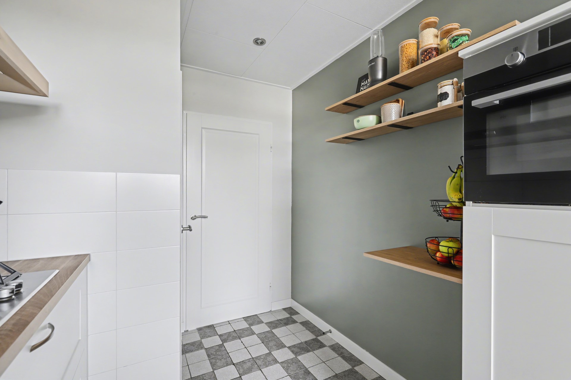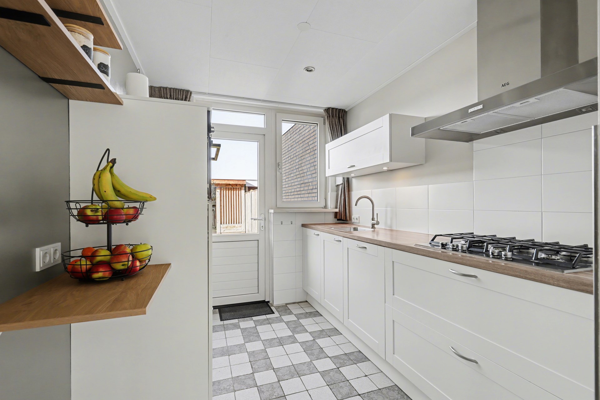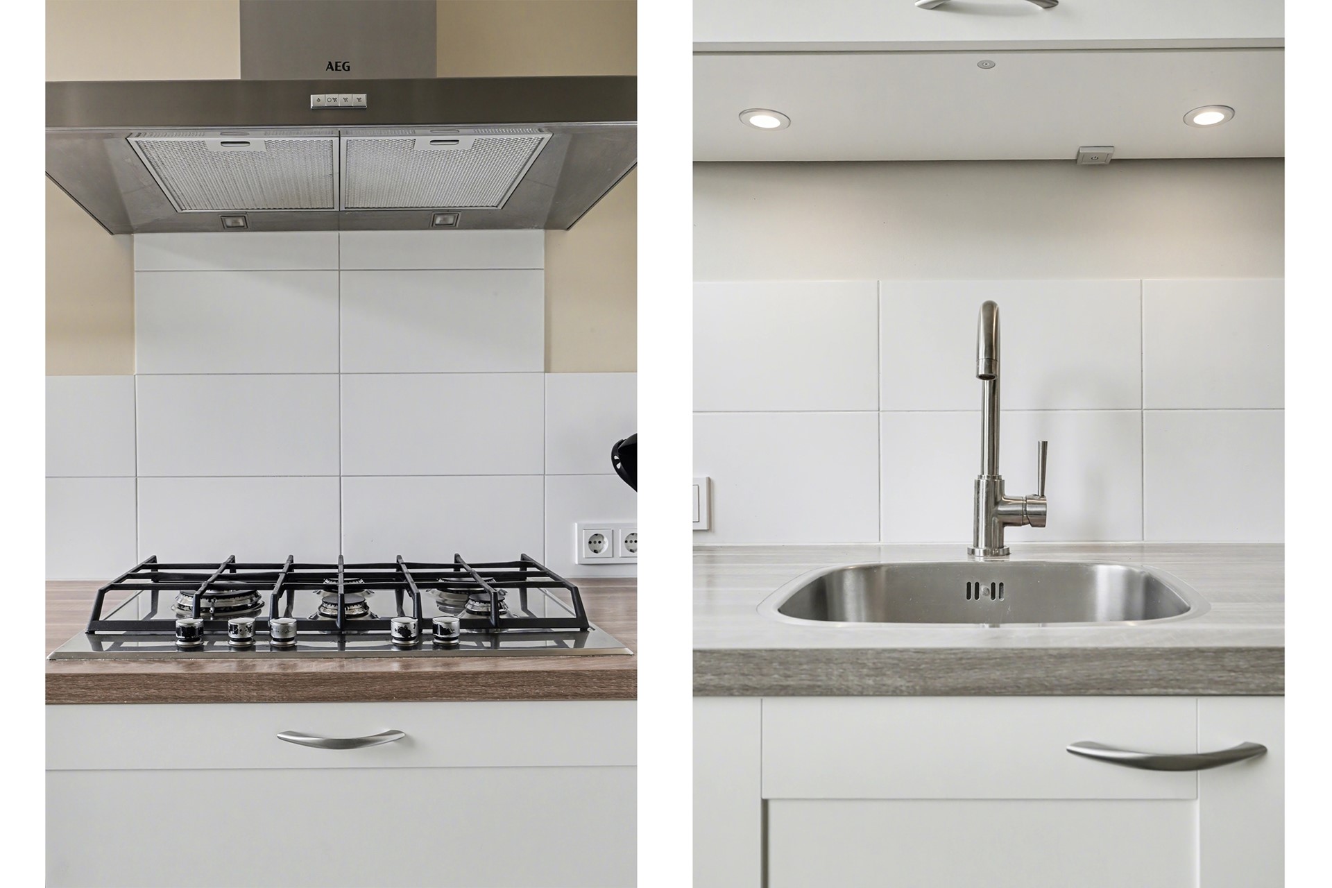 De moderne gesloten keuken (2017) is uitgevoerd in een rechte opstelling en voorzien van diverse inbouwapparatuur, waaronder een koelkast, vriezer, 5-pits gasfornuis met afzuigkap, combi-oven en vaatwasser. Het werkblad en de afwerking zijn netjes en tijdloos. Vanuit de keuken is er eveneens toegang tot de tuin en er is een praktische kelderkast aanwezig.