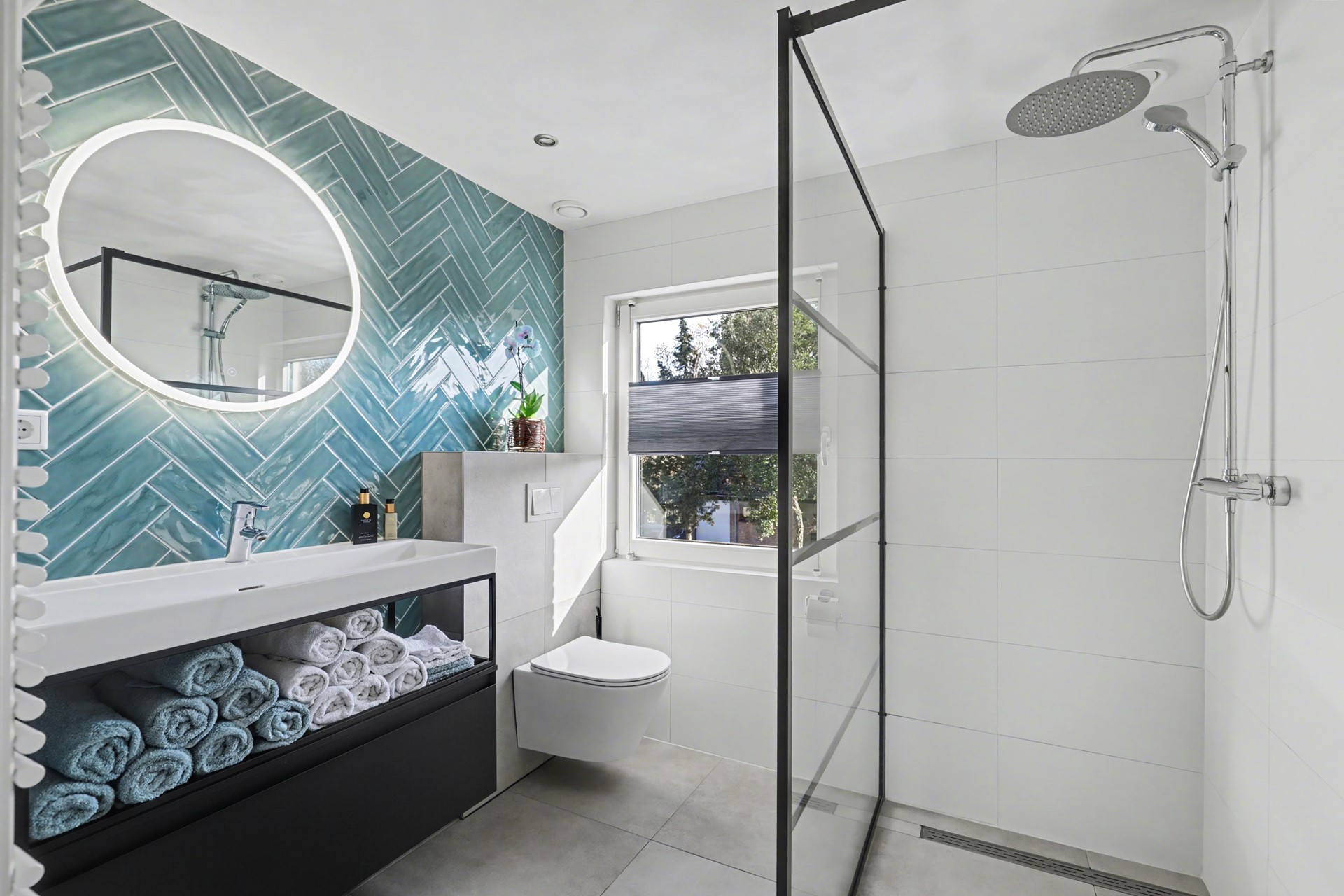 De badkamer is stijlvol afgewerkt en voorzien van een ruime inloopdouche en een modern wastafelmeubel met opbergruimte. Deze sfeervolle ruimte combineert comfort en luxe ideaal voor een verfrissende start of ontspannen afsluiting van de dag.