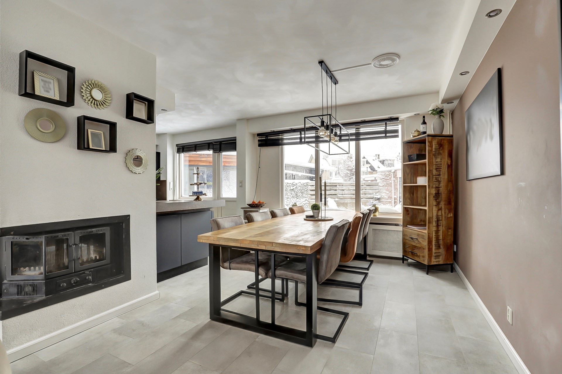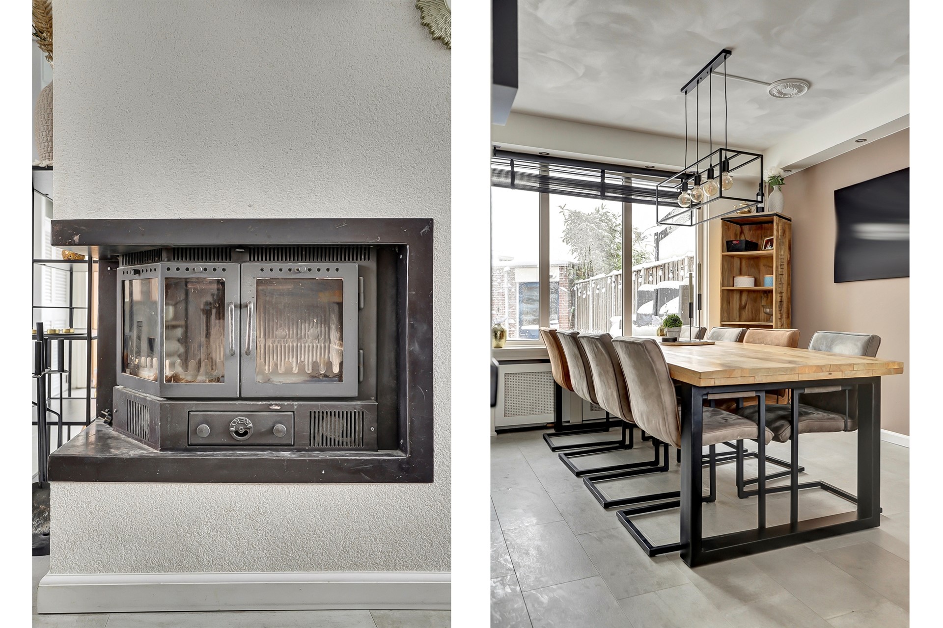 De sfeervolle houtkachel vormt een warm en gezellig middelpunt en draagt bij aan een aangename ambiance, ideaal voor lange avonden thuis. Via de woonkamer is er directe toegang tot de tuin. De overkapping maakt het mogelijk om het hele jaar door comfortabel van het buitenleven te genieten, beschut tegen regen en felle zon.