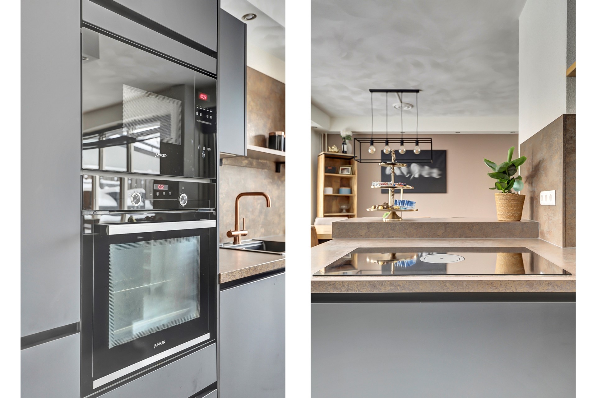 Uitgevoerd in een strak design en met hoogwaardige materialen, is deze keuken van alle gemakken voorzien. De inductiekookplaat met geïntegreerde afzuiging zorgt voor een open, ruimtelijk gevoel zonder hinderlijke afzuigkap. Daarnaast beschikt de keuken over een oven en een magnetron, een ingebouwde vaatwasser en een royale koelkast. Dankzij de slimme indeling van kasten en lades is er volop opbergruimte, waardoor alles altijd netjes en overzichtelijk blijft.
