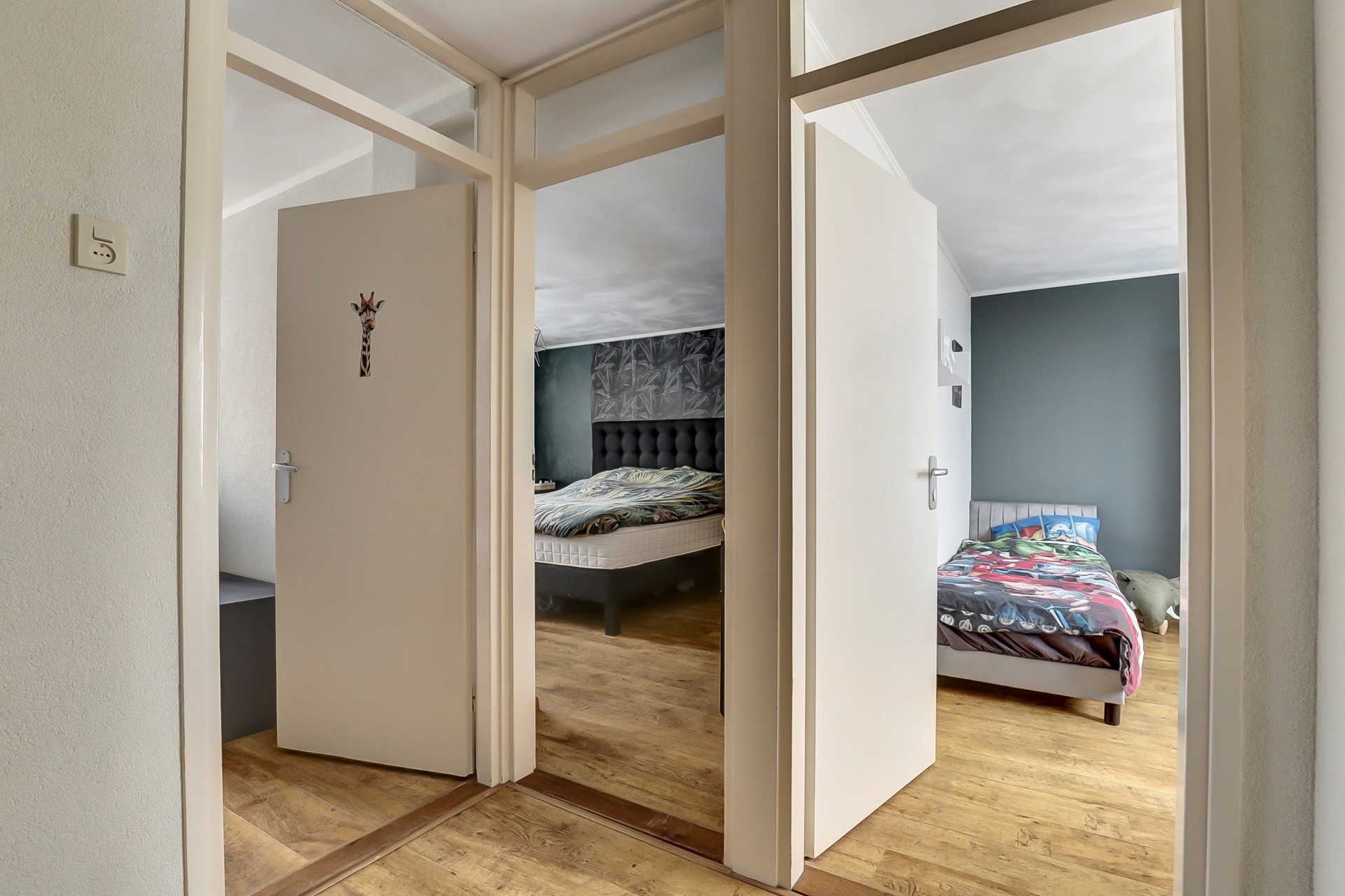 Overloop met de cv-combiketel (2012), aansluitingen voor wasapparatuur en praktische bergruimte. Vanaf hier bereik je slaapkamer met dakkapel, momenteel verdeeld in twee slaapkamers. Ideaal voor wie een extra slaapkamer werkkamer of hobbyruimte wil creëren.